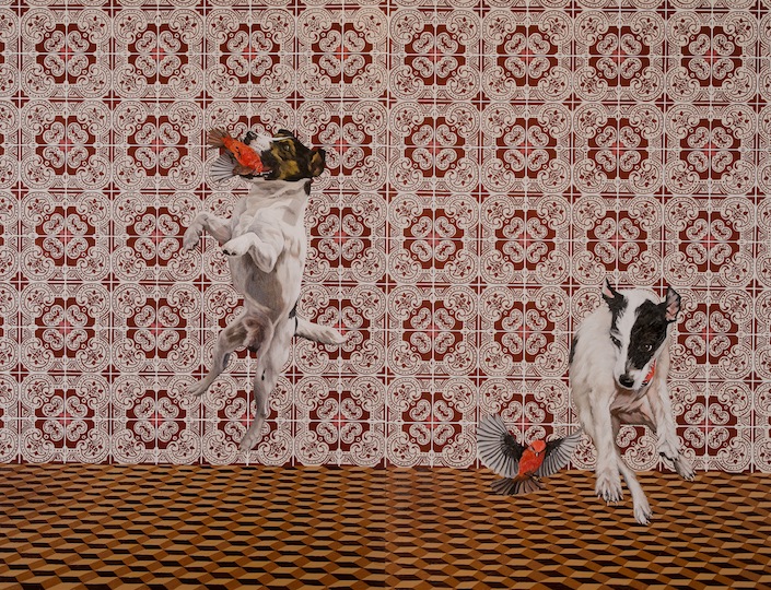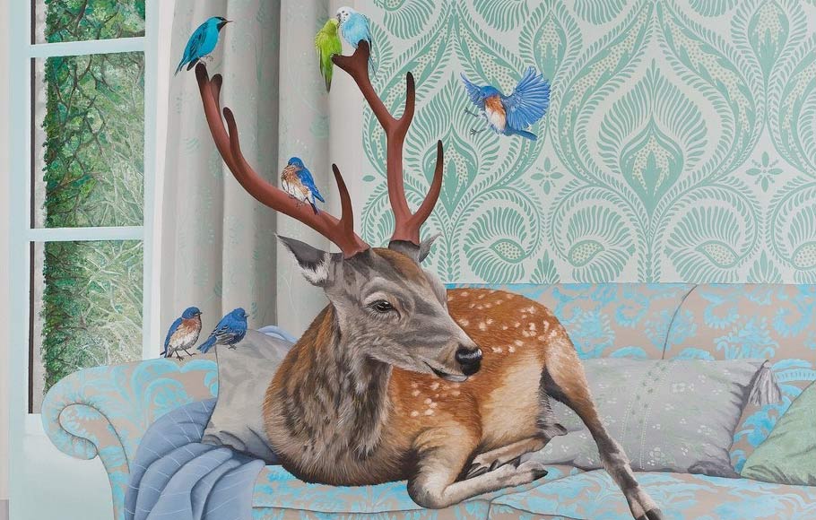 Nos quadros expostos na Galeria Leme, em São Paulo, você pode encontrar referências de Athos Bulcão a Justin Bieber, entre azulejos e papéis de parede florais clássicos em cenários onde transitam veados ou flamingos em sofás ou espelhos d’água.