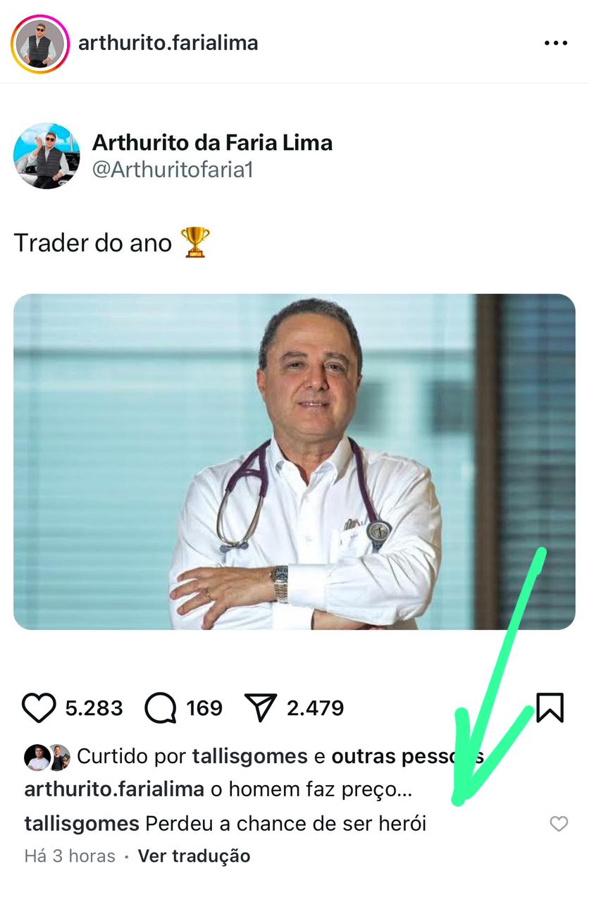 Postagem do empresário Tallis Gomes sugerindo que médico de Lula o matasse