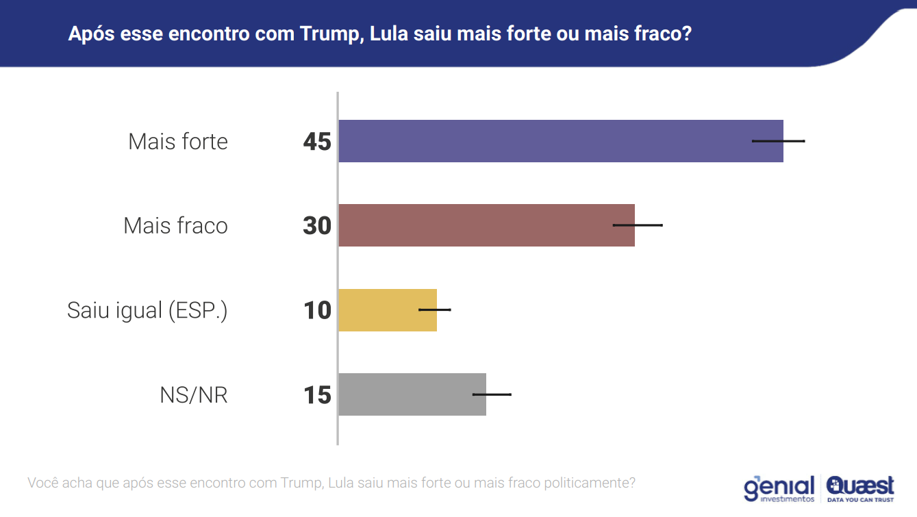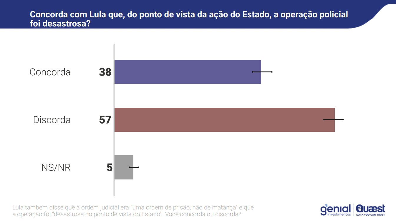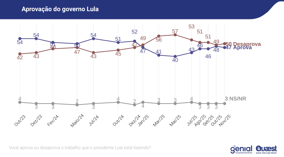 A Quaest ouviu 2.004 pessoas entre os dias 6 e 9 de novembro, a pedido da Genial Investimentos. O nível de confiança é de 95%. A pesquisa também avaliou a percepção sobre temas recentes, como a megaoperação policial no Rio e o encontro de Lula com o presidente estadunidense Donald Trump.