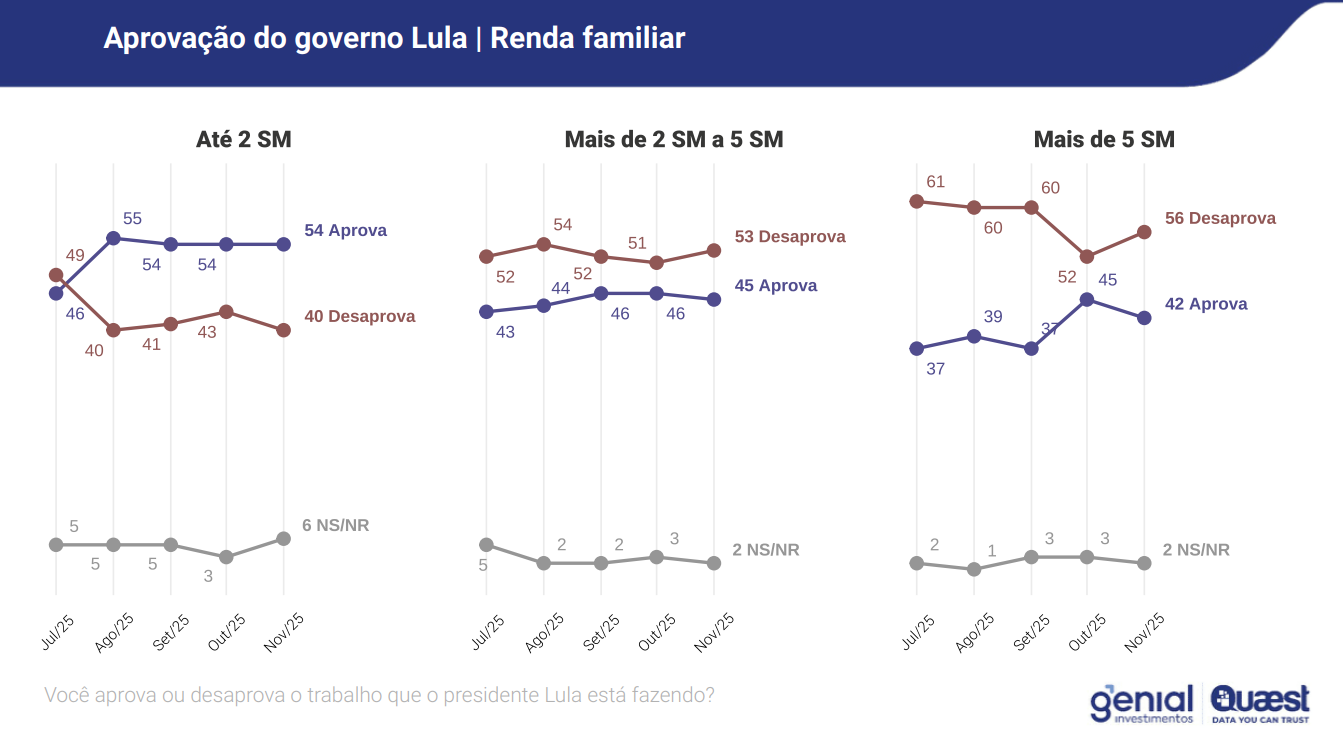 Entre os que ganham de dois a cinco salários, o cenário também piorou — a desaprovação subiu para 53% e a aprovação caiu para 45%. Já entre os mais pobres, com renda até dois salários, a aprovação se mantém maior, com 55%, frente a 40% de desaprovação.