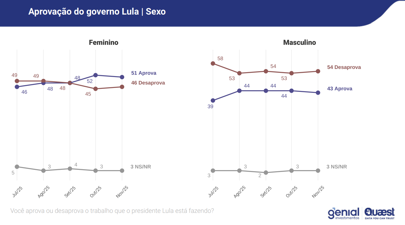 A pesquisa também revela que, pela segunda vez consecutiva, aprovação e desaprovação estão tecnicamente empatadas. Em outubro, a diferença entre os dois índices era de apenas um ponto; agora, subiu para três. O levantamento mostra que, entre fevereiro e setembro, a desaprovação era consistentemente maior, atingindo 57% em maio, contra 40% de aprovação.