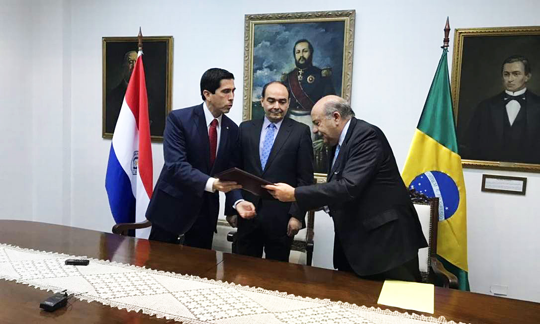 O embaixador do Brasil no Paraguai, Carlos Alberto Simas Magalhães, (dir.) anula acordo de Itaipu
