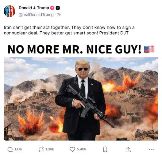 O presidente dos Estados Unidos, Donald Trump, voltou a ameaçar o Irã nesta quarta-feira (29), em meio ao impasse nas negociações para encerrar a guerra no Oriente Médio. Em publicação na Truth Social, o republicano disse que “não será mais o cara legal” e compartilhou uma montagem em que aparece de óculos escuros, segurando um fuzil, com explosões ao fundo.