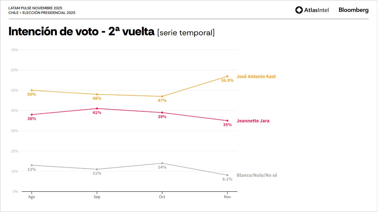 A pesquisa mais recente da AtlasIntel mostra uma vantagem clara para o candidato José Antonio Kast (Partido Republicano) no segundo turno das eleições presidenciais do Chile, previsto para 14 de dezembro de 2025. Kast lidera a disputa com 56,9% dos votos, enquanto a candidata governista Jeannette Jara (Partido Comunista) soma 35,0%.