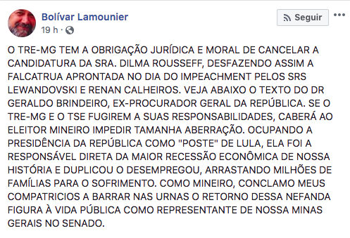 Faltam vinte dias para a eleição. Conclamo meus compatricios mineiros – os que moram em Minas e os que vivem em outros estados- para um combate sem trégua contra a candidatura de Dilma Rousseff. Não consigo imaginar que nosso estado, orgulhoso como é de sua rica história política, possa permitir a eleição de uma farsante como ela. Ignorante e irresponsável, Dilma é a responsável direta pela catástrofe econômica que se abateu sobre nosso país, causando dois anos e meio de recessão e arrastando milhões de famílias para o desemprego e o sofrimento. Decididamente, Dilma Rousseff não merece e não pode representar nossa Minas Gerais no Senado.