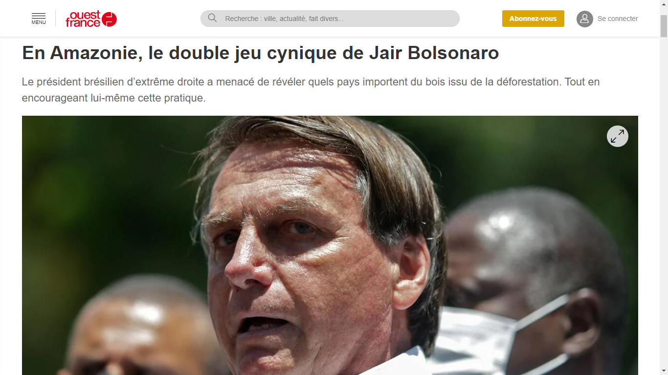 “Na Amazônia, o duplo jogo cínico de Jair Bolsonaro”, diz o jornal francês Ouest France, maior jornal regional do país.