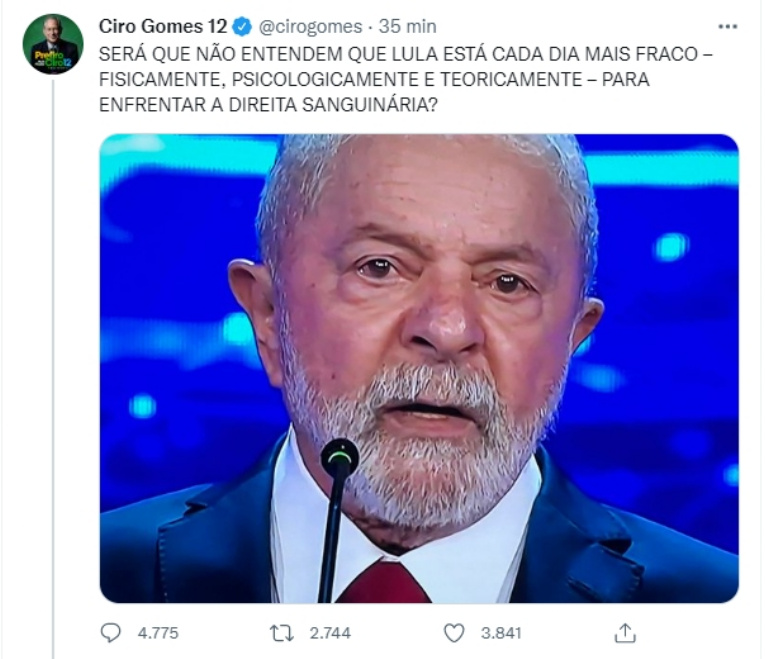 Ciro foi questionado sobre a publicação em que colocava em dúvida o estado de saúde de Lula. No tuíte, ele comentava que o petista “está cada vez mais fraco, fisicamente, psicologicamente e teoricamente (sic), para enfrentar a direita sanguinária”.