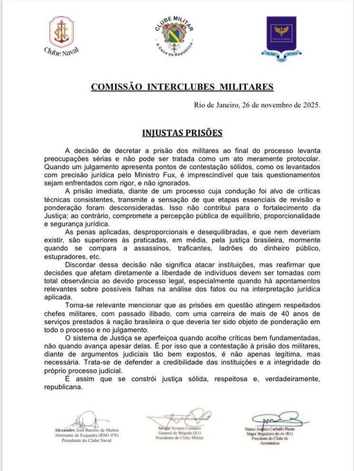 O texto afirma que “A decisão de decretar a prisão dos militares ao fim do processo levanta preocupações sérias e não pode ser tratada como um ato meramente protocolar. Quando um julgamento apresenta pontos de contestação sólidos, como os levantados com precisão jurídica pelo ministro Fux, é imprescindível que tais questionamentos sejam enfrentados com rigor, e não ignorados”. A manifestação é assinada por dirigentes dos clubes Naval, Militar e da Aeronáutica.