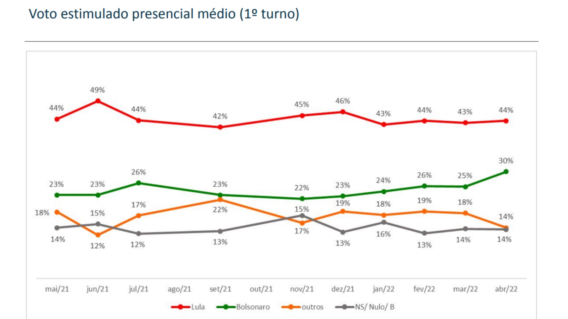 Realizada pelo instituto Vox Populi, uma compilação de várias pesquisas de opinião mostra o ex-presidente Lula (PT) na liderança isolada da corrida presidencial, com uma média 44% das intenções de voto. O atual chefe do Executivo, Jair Bolsonaro (PL), aparece bem atrás do petista, com 30%. Os demais candidatos somam em média 14%, mesmo número dos brancos e nulos.