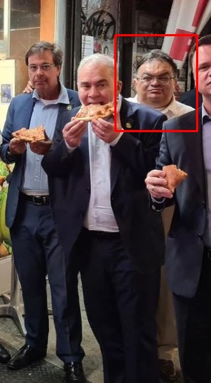 E também o ministro da Saúde, Marcelo Queiroga, com a boca escancarada para morder a pizza.