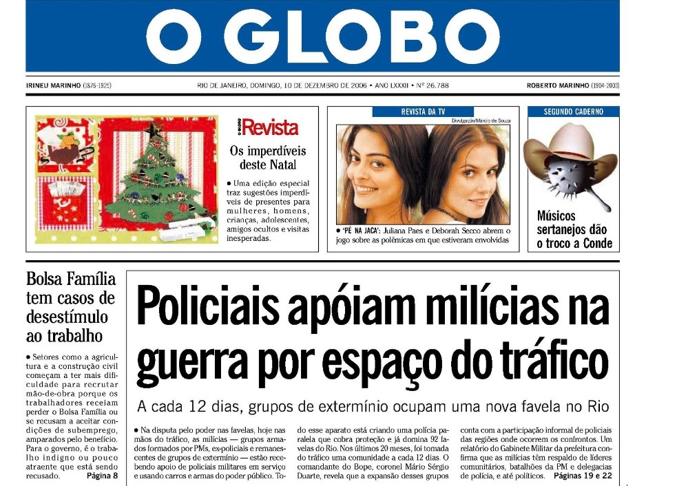 O surgimento de novos capítulos na investigação do assassinato da vereadora Marielle e de seu motorista Anderson remete a atenção para a questão das milícias do Rio de Janeiro e como elas foram tratadas e noticiadas ao longo deste início de século. Neste período, o jornal O Globo seguiu uma linha editorial de apoio, facilmente verificável na pesquisa da historiadora Michelle Airam. Na edição de domingo, 10 de dezembro de 2006, a manchete destacava que “Policiais apoiam milícias na guerra por espaço do tráfico – A cada doze dias grupos de extermínio ocupam uma nova favela no Rio”. No mesmo jornal, em continuação à matéria, o título é ainda mais objetivo: “A polícia paralela – Milícias expulsam traficantes de drogas e já controlam 92 favelas.”