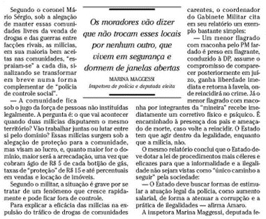Com bem lembra e destaca a historiadora, o jornal ainda “errou” ao analisar um mapa formulado pela corregedoria. Segundo Airam, “apesar da chamada da capa tratar das ‘áreas dominadas pelas milícias serem ocupadas anteriormente por traficantes’, à informação não procedia. Afinal, a favela de Rio das Pedras, e muitas outras, não contavam com a presença de traficantes. O mapa apresenta outra informação, mas a narrativa jornalística buscava dar destaque as ‘ações’ positivas e legitimadoras desses grupos, assim representava grande parte de seus leitores e anunciantes”.