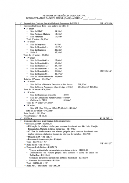 Sobre os demonstrativos de nota fiscal entregues ao MPF, explicou que eles lhe eram passados pela Network para conferência dos serviços a serem pagos, e não apareciam discriminados nas notas fiscais emitidas pelo Departamento de Suprimentos, que ignorava a natureza exata dos serviços prestados. “Era minha função receber esses dados e conferir junto aos solicitantes [da Vale], pois, além dos itens fixos, outros eram pedidos diretamente pelos integrantes do Departamento de Segurança Empresarial sem passar pelo meu crivo”, explicou. Os dados da Network eram comparados aos das planilhas confeccionadas pelos funcionários da Vale que solicitavam os serviços, orientação reforçada por um e-mail de outubro de 2011 do diretor de Segurança Empresarial, Gilberto Ramalho (que substituiu Gruba em 2011), “visando melhor controle sobre a apropriação dos serviços prestados pela Network”, que dava as instruções para o preenchimento das planilhas.
