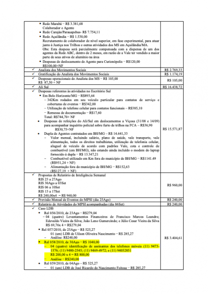 “Um exemplo de pedido direto (à Network) foi a infiltração de um agente no movimento Justiça nos Trilhos pelo Gerente Geral de Segurança Norte, Roberto Monteiro”, diz, mostrando um demonstrativo de junho de 2011, com o pagamento total de R$247.807,74 a Network. Ali, na prestação de contas do Escritório Norte (Pará e Maranhão), no item “Rede Açailândia”, consta a despesa de R$ 1.635,00 referente ao “recrutamento de colaborador de nível superior, em fase experimental, para atuar junto à Justiça nos Trilhos e outras atividades dos MS (Movimentos Sociais) em Açailândia/Maranhão”.
