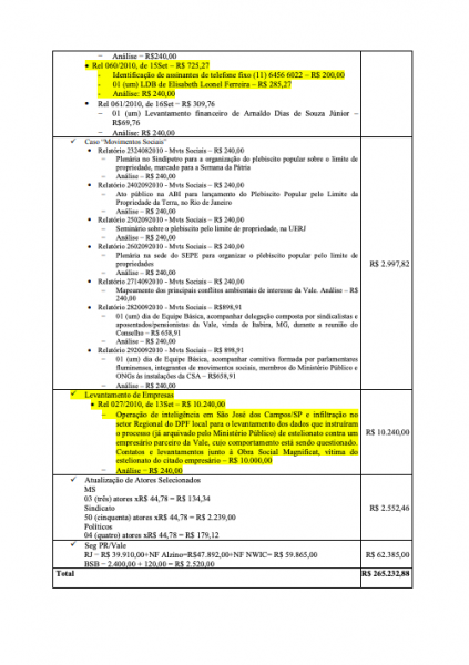 Outra do mesmo gênero, que consta do anexo 2 enviado ao MPF, refere-se a um relatório de 13 de setembro de 2010, custou R$10.240,00 e está descrita como “Operação de inteligência em São José dos Campos/SP e infiltração no setor Regional do DPF local para o levantamento dos dados que instruíram o processo (já arquivado pelo Ministério Público) de estelionato contra um empresário parceiro da Vale, cujo comportamento está sendo questionado. Contatos e levantamentos junto à Obra Social Magnificat, vítima do estelionato do citado empresário”. (Veja a íntegra abaixo, antes do box)