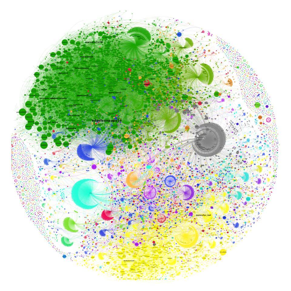 No grafo, toda a área verde representa a produção robótica dessas contas, que inflam de RTs seus hubs, tais como @Corotenho (http://bit.ly/2dd5PFA), @bolsonarozuero, @carlosbolsonaro, mvsmotta etc. Nesse grupo, de 3.5 mil bots (Grafo 02), nas últimas 48 horas, foram gerados mais de 14 mil compartilhamentos (RTs).