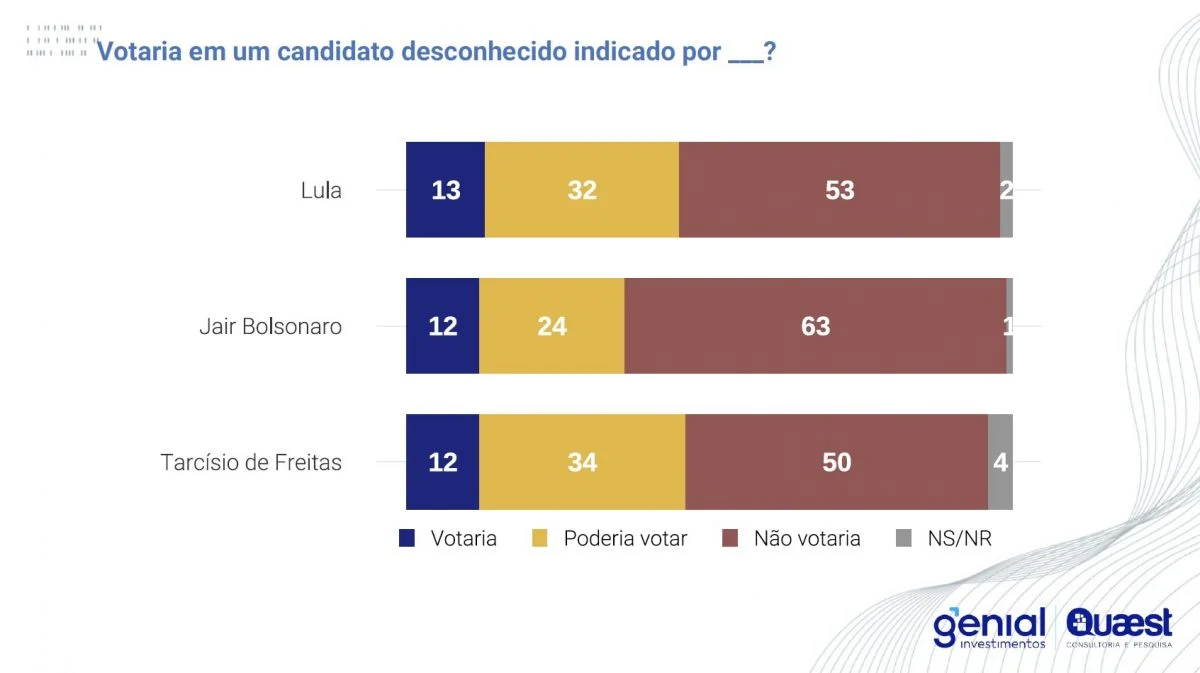 Segundo o levantamento, 12% dos entrevistados votariam em um nome desconhecido apoiado pelo ex-presidente Jair Bolsonaro (PL) e 24% afirmam que talvez votariam.