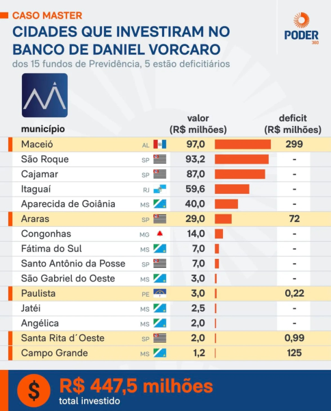 Dessas 15 cidades, 5 apresentam déficits em seus fundos de previdência, ou seja, os investimentos não são suficientes para garantir o pagamento das aposentadorias. O município com o maior déficit é Maceió (AL), com um rombo de R$ 299,4 milhões. O fundo de previdência de Maceió aplicou R$ 97 milhões em letras financeiras do Banco Master, o maior volume entre os municípios. Além de Maceió, apresentam déficit os fundos de Campo Grande (MS), Araras (SP), Santa Rita d’Oeste (SP) e Paulista (PE). Informações de PODER360.