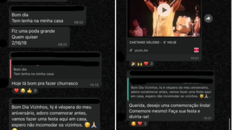Em um dos grupos, o “Assuntos Gerais Solar BSB”, moradores comentaram encontros sociais e compartilharam vídeos e músicas. Entre os envios, estava um link com a canção “É Hoje”, de Caetano Veloso. Um participante brincou que o dia estava apropriado para um churrasco, enquanto uma moradora avisou que faria uma comemoração antecipada de aniversário em casa.