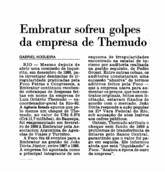 O dono da Foco, Luiz Octávio Themudo, chegou a responder a uma ação popular na Justiça Federal no Rio de Janeiro, juntamente com João Doria, por superfaturamento nos contratos com a Embratur.
