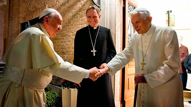 Embora o encontro de 2012 seja ficção, é verdade que os dois homens estiveram juntos em Castel Gandolfo, mas foi em março de 2013, depois que Bento renunciou e Bergoglio já assumira seu posto.