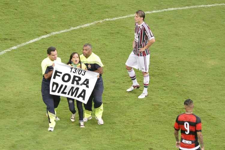 Kelly parece gostar de aparecer. Ela já invadira um campo de futebol com um cartaz em que pedia o impeachment de Dilma.