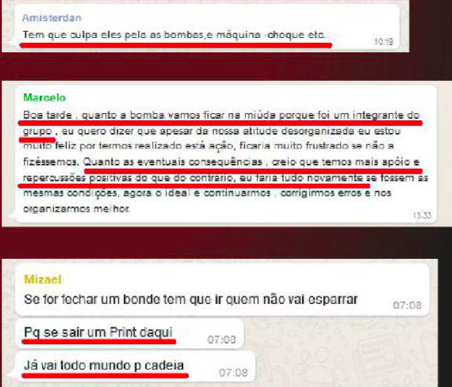 As conversas explicitam as táticas e meios — como bombas, taser, spray de pimenta e canos de PVC “disfarçados” de bandeira — a serem utilizados para espalhar o terror e a violência. O objetivo do grupo é desmascarado nos diálogos em que revelam disputas políticas, violência física, chacina e intimidação dos estudantes e professores da universidade, além de preconceitos como homofobia, machismo, racismo e discursos de ódio contra a esquerda. Há ainda ameaças criminosas de espancamento a alvos específicos.
