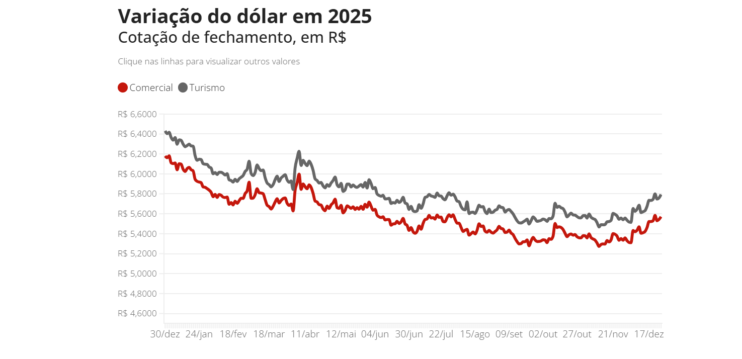 Ao longo do ano, a moeda norte-americana foi impactada pela cautela de Donald Trump, que, ao invés de adotar medidas mais agressivas de aumento de tarifas, como o mercado esperava, preferiu um ritmo mais gradual de políticas.
