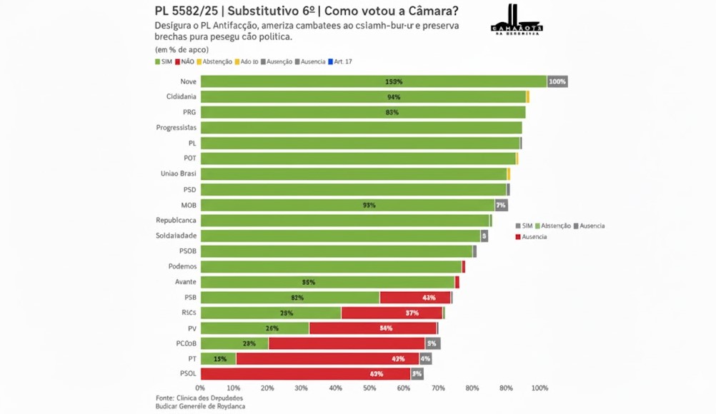 O levantamento de votos mostra que Novo, Cidadania, PRD, Progressistas, PL, PDT, União Brasil, PSD e MDB registraram percentuais muito altos de apoio ao substitutivo, acima de 88%. Republicanos, Solidariedade, PSDB e Podemos também votaram majoritariamente a favor. Partidos intermediários como Avante, PSB, Rede e PV tiveram votação dividida, com abstenções e ausências relevantes.