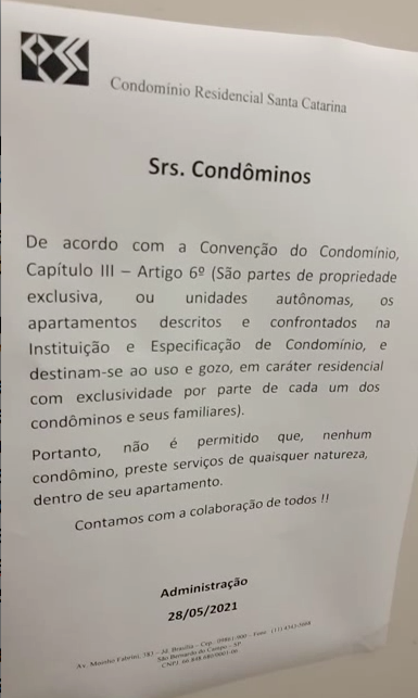 “Não é permitido que nenhum condômino preste serviços de qualquer natureza dentro de seu apartamento”, diz um aviso nos elevadores.