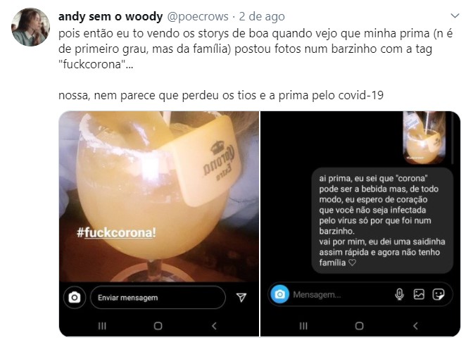 Andrezza fez esse relato (imagem acima) nas redes sociais alertando uma prima sobre os riscos de contágio pela covid-19. A jovem também denuncia que os bares próximas de sua casa no Rio de Janeiro estão lotados de pessoas sem máscaras, compartilhando copos e desrespeitando o distanciamento mínimo.