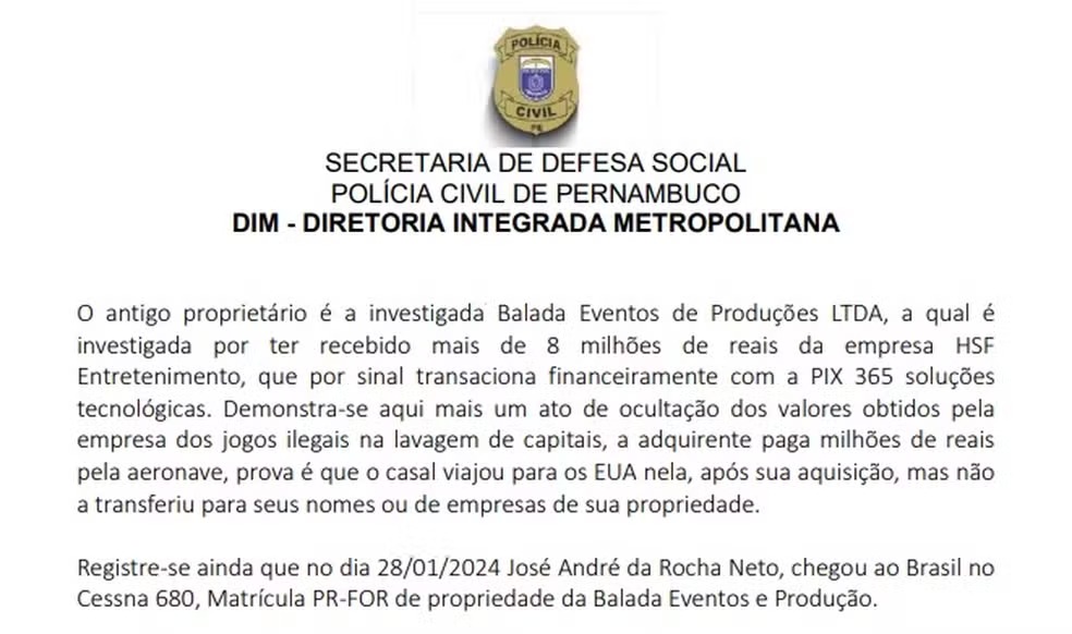 Segundo o relatório da Polícia Civil de Pernambuco, a aeronave foi usada para cometer o crime por parte da J.M.J., empresa de José André da Rocha Neto.