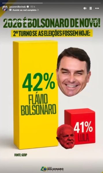 Jason Miller, conselheiro do presidente dos Estados Unidos, Donald Trump, compartilhou uma pesquisa picareta que aponta Flávio Bolsonaro (PL-RJ) à frente de Lula em um eventual segundo turno nas eleições de 2026. O levantamento foi feito pelo Instituto Gerp, que é conhecido por diversos erros.