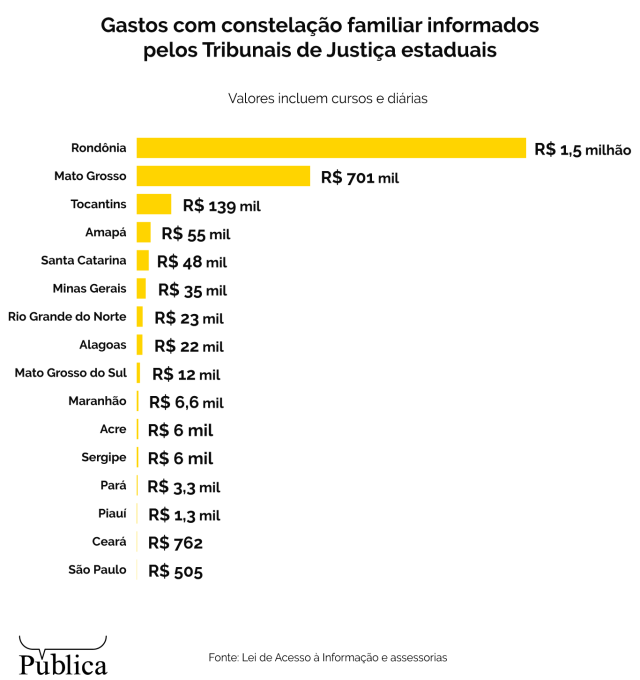 O Tribunal de Justiça de Rondônia (TJRO) é o que acumula os maiores gastos com constelação entre todos os que responderam à reportagem: R$ 1,5 milhão com cursos e palestras a servidores. A reportagem solicitou ao tribunal o número de atividades realizadas sobre o tema e o montante investido, mas não obteve retorno. Os valores apurados pela Pública foram encontrados em publicações do Diário Oficial do TJRO.