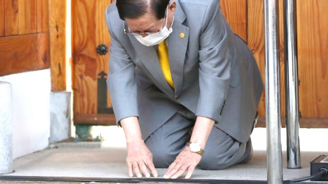 Lee Man-hee, da Igreja Shincheonji de Jesus, ajoelhou-se e fez uma reverência em uma entrevista coletiva.