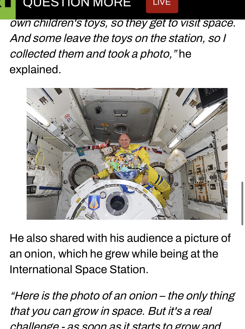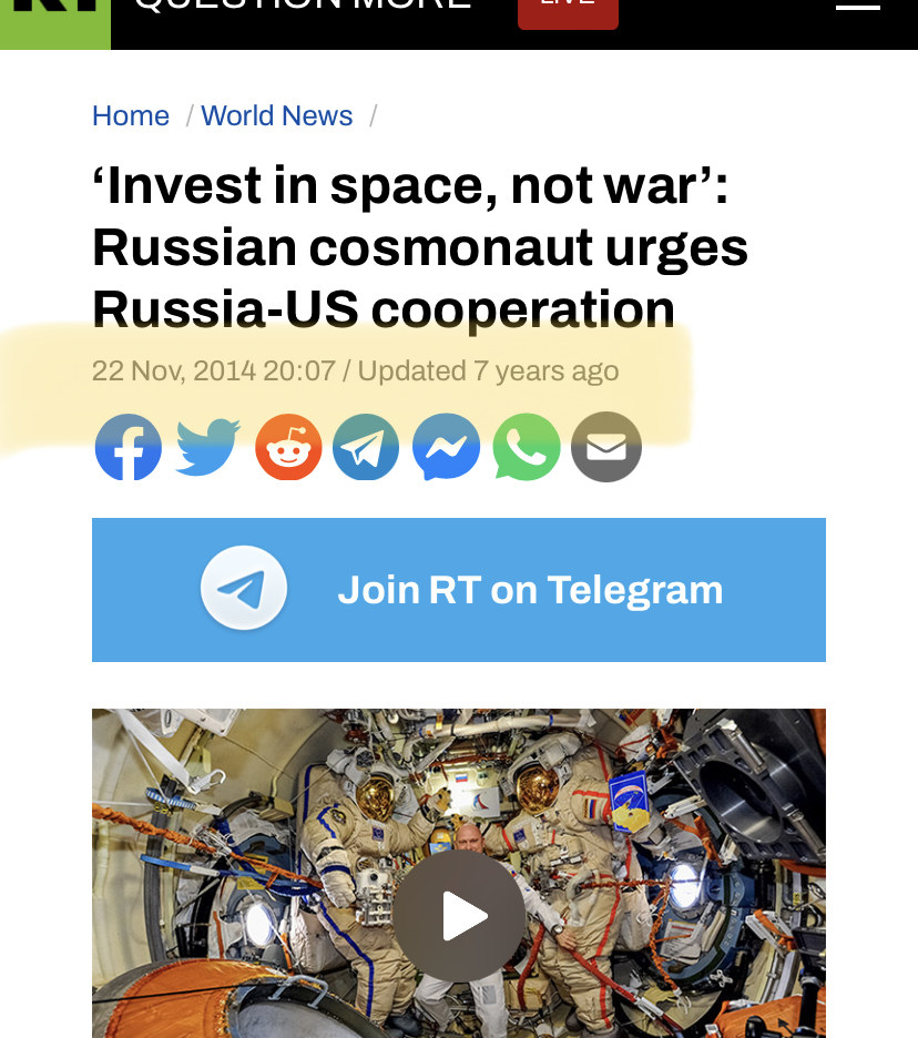 “Três cosmonautas russos chegaram à Estação Espacial Internacional vestindo roupas amarelas com detalhes em azul, cores da bandeira da Ucrânia”, diz o Globo, repercutindo o Guardian, New York Times, BBC etc.