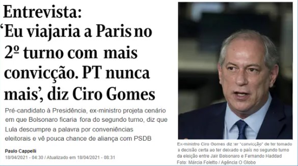 Deixaria claro, assim, que pretende se posicionar como o anti-Lula e, querendo ou não, disputar, na prática o que é hoje o eleitorado do ex-capitão. Não é impossível, claro, que nas franjas deste eleitorado, sobretudo entre os mais pobres, migrem votos para Ciro e até mesmo para Lula (e para todos os outros candidatos) à medida em que o governo Bolsonaro venha a se esboroar na crise, mas daí a prever-se que isso vá se deslocar em bloco para o ex-governador do Ceará é admitir que ele venha a ser o novo enfant terrible do antipetismo vai uma imensa distância, pelo grau de resistências que ele próprio acumulou.