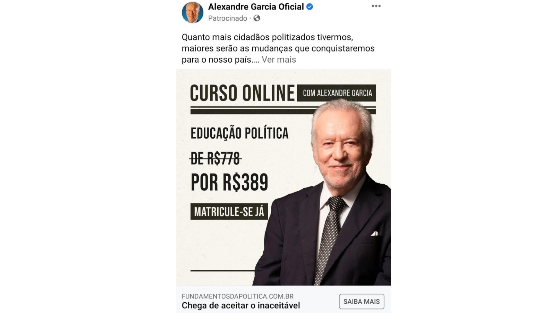 O jornalista bolsonarista Alexandre Garcia, demitido da CNN Brasil no ano passado por divulgar fake news, agora está vendendo um curso online sobre “educação política”.