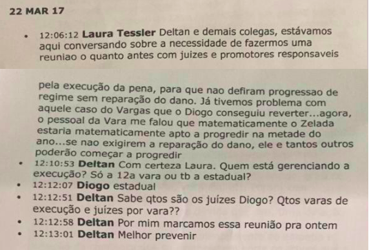 Segundo diálogo obtido com exclusividade pelo portal Diário do Centro do Mundo, os procuradores Laura Tessler, Deltan Dallagnol e Diogo Castor de Mattos, sugeriam a necessidade de “uma reunião o quanto antes com juízes e promotores responsáveis pela execução da pena, para que não defiram progressão de regime sem reparação de dano”.