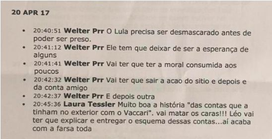 No dia 20 de abril de 2017, em conversa com sua colega Laura Tessler, o procurador federal Antônio Carlos Welter, membro da Lava Jato de Curitiba, dispara uma série de mensagens que formam uma espécie de desabafo macabro. Essas mensagens não são inéditas, mas vale a pena lembrar delas: