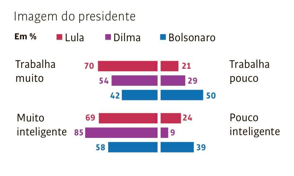 “Para conseguir maior apoio da opinião pública e consolidar suas propostas de governo, Bolsonaro deve adequar-se ao cargo e mostrar serviço — metade dos brasileiros acha que ele trabalha pouco e é antiquado, imagem muito pior do que a de seus antecessores petistas”.