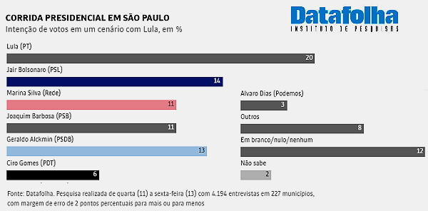 Geraldo Alckmin amarga um precário terceiro lugar nas intenções de votocom Lula na disputa, com 13 pontos, abaixo de Jair Bolsonaro (14%) e de Lula (20%). Convém lembrar, para comparação, que concorrendo a presidente em 2006, teve, no 1° turno, 54,2% dos votos, contra 36,8 de Lula.