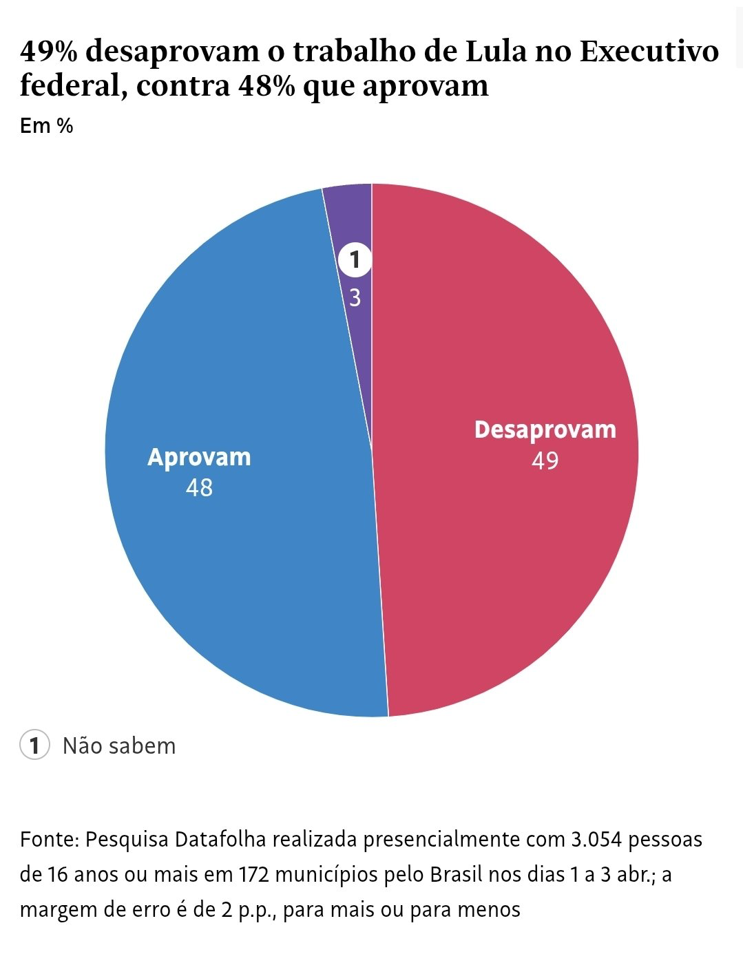 Mesmo com a melhora desde fevereiro, a expectativa em relação ao futuro do governo não melhorou: 35% acham que Lula fará uma gestão ótima ou boa, mesmo índice dos que esperam um governo ruim ou péssimo. Outros 28% acreditam que será regular. É a primeira vez que o otimismo não supera o pessimismo numericamente.
