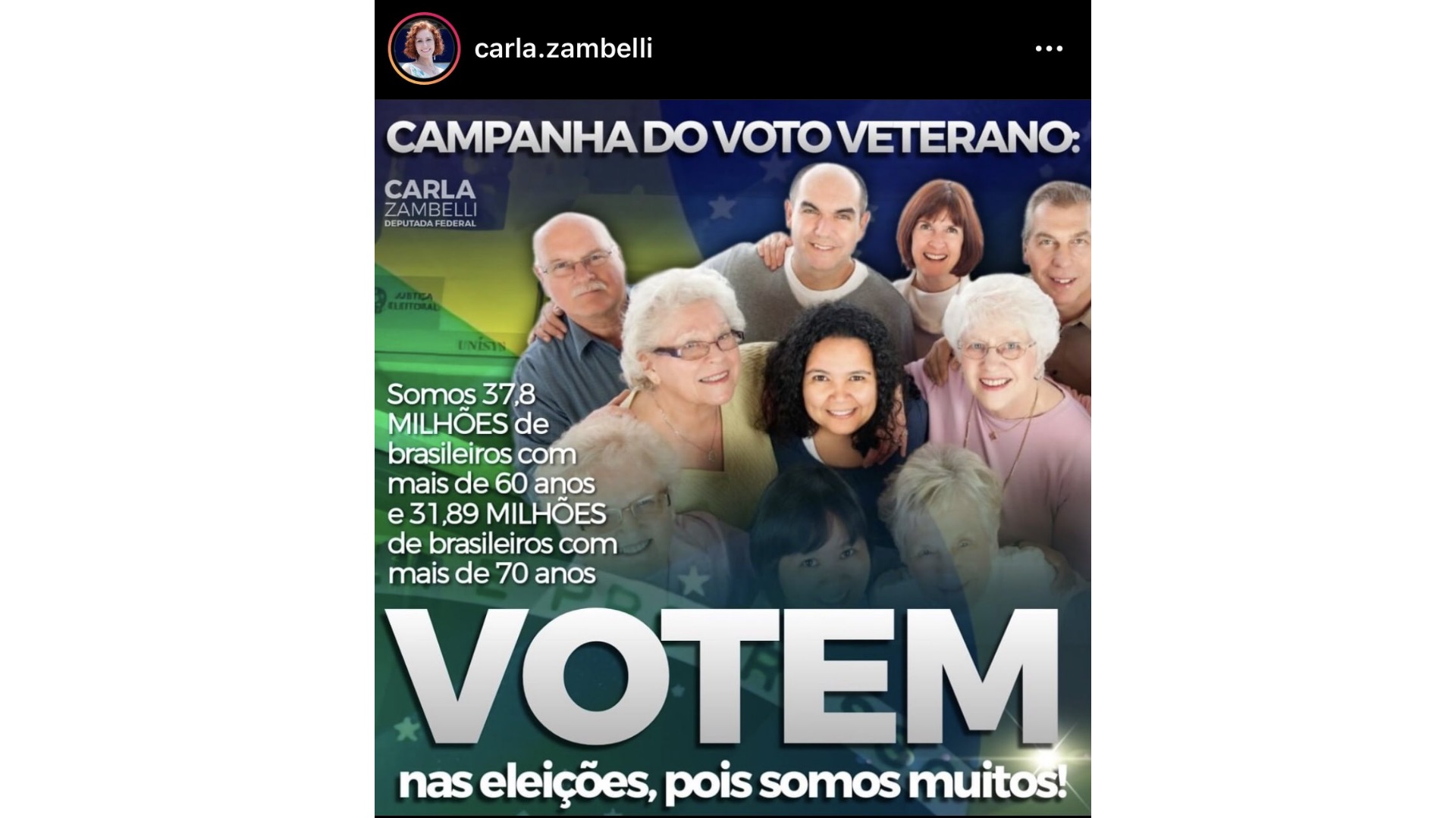 Em seu perfil do Instagram, com mais de 2 milhões de seguidores, ela publicou um banner com uma foto de vários idosos reunidos que diz: “Somos 37,8 milhões de brasileiros com mais de 60 anos e 31,89 milhões de brasileiros com mais de 70 anos. Votem nas eleições, pois somos muitos!”