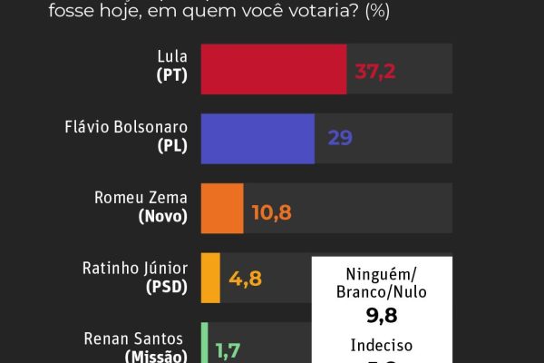 No cenário estimulado com maior vantagem, Lula aparece com 37,2% das intenções de voto, seguido por Flávio Bolsonaro, com 29%. Romeu Zema (Novo) surge em terceiro lugar, com 10,8%, enquanto outros nomes testados registram percentuais menores. Em diferentes recortes, Lula mantém variação entre 35,5% e 36,9%, sempre à frente dos adversários.