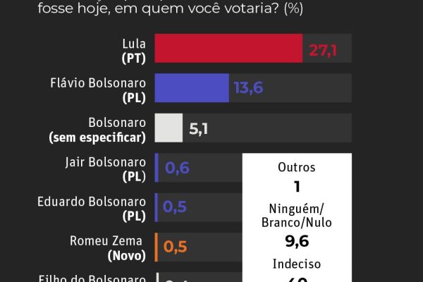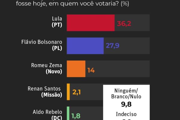 Na pesquisa espontânea, quando os nomes não são apresentados aos entrevistados, 40% dos eleitores mineiros disseram estar indecisos. Nesse cenário, Lula foi citado por 27,1% dos entrevistados, enquanto Flávio Bolsonaro aparece com 13,6%.