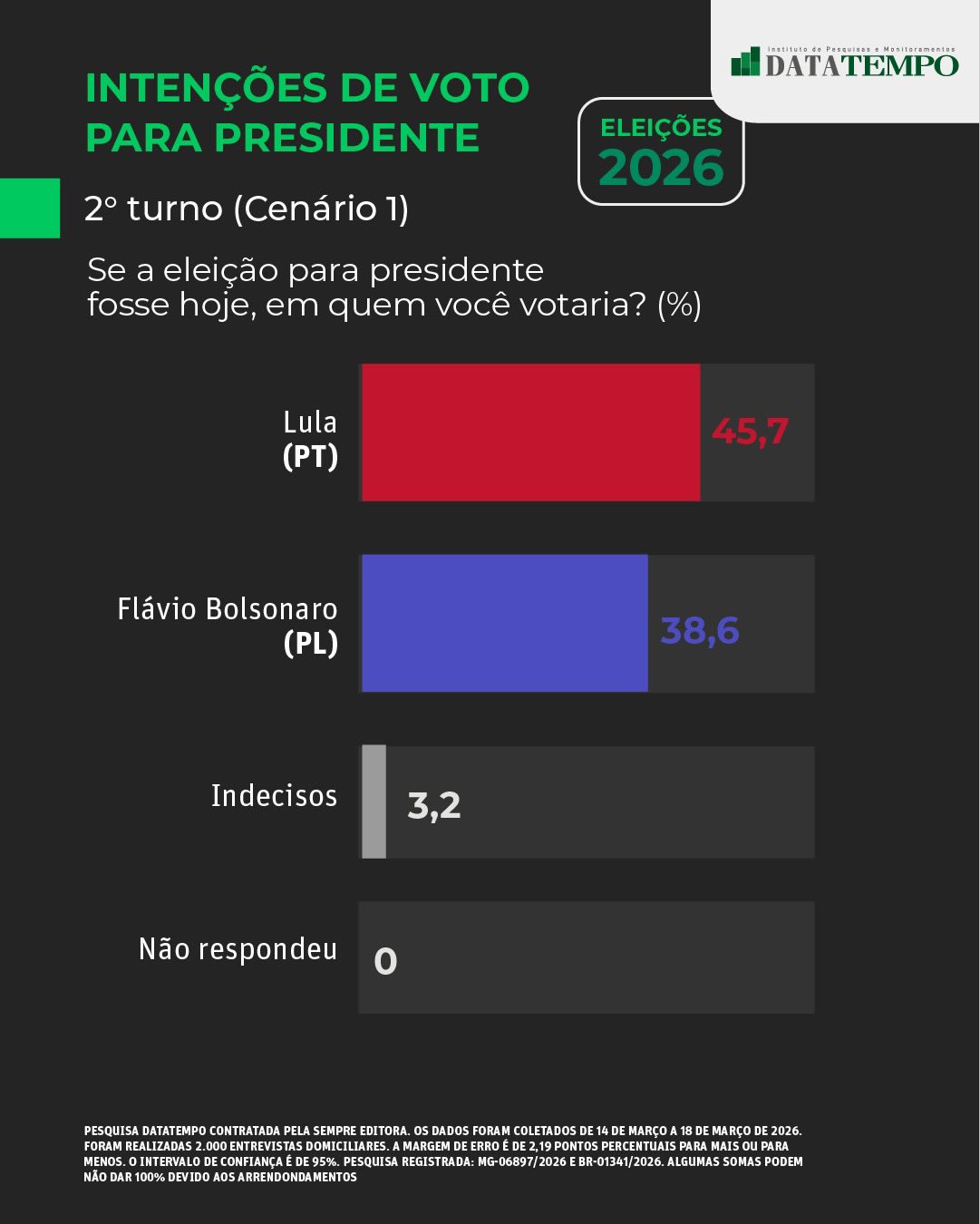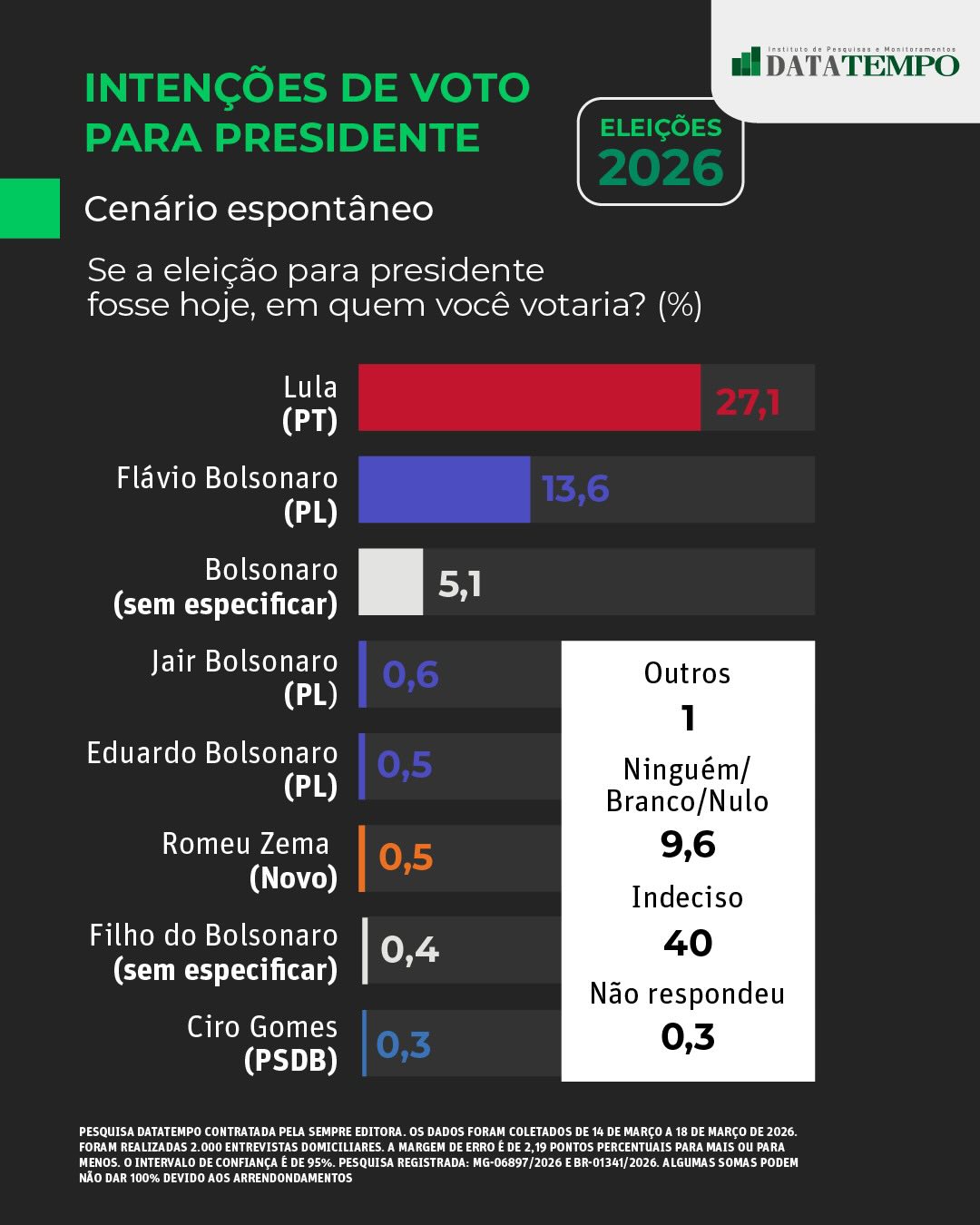 A pesquisa foi realizada entre os dias 14 e 18 de março, com 2.000 entrevistas domiciliares. A margem de erro é de 2,19 pontos percentuais, com nível de confiança de 95%. O levantamento está registrado sob os números MG-06897/2026 e BR-01341/2026.[