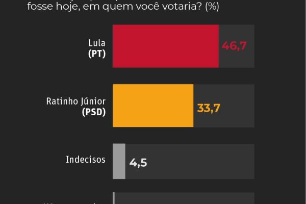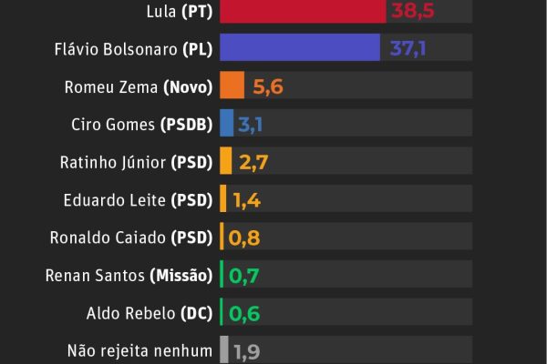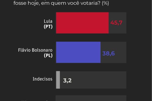 Em simulações de segundo turno, Lula também lidera numericamente. Contra Flávio Bolsonaro, o petista aparece com 45,7% dos votos, frente a 38,6% do senador. Já em um eventual confronto com Romeu Zema, há empate dentro da margem de erro, com 42,7% para Lula e 41,1% para o ex-governador.