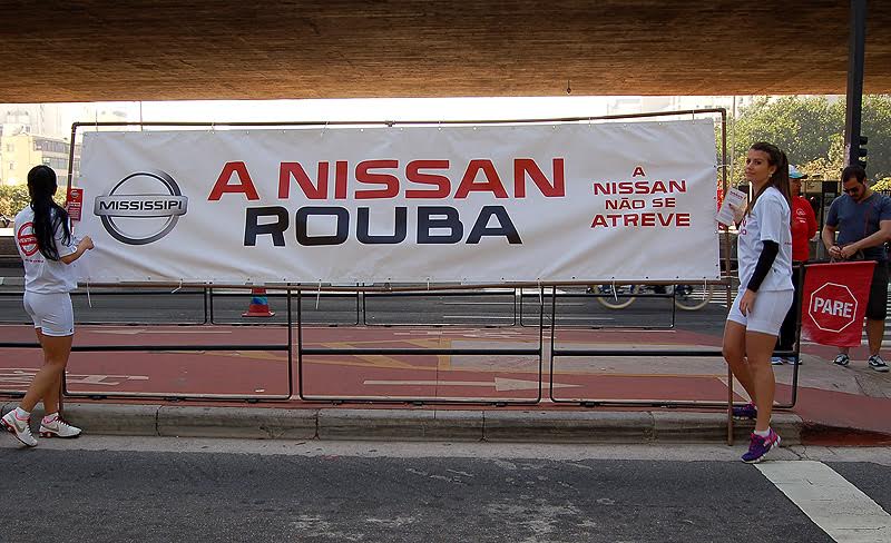 Dos 7 mil trabalhadores da fábrica do Mississipi, 40% são terceirizados que ganham metade ou às vezes um terço do que ganha um trabalhador regular”, afirmou Rafael Messias Guerra, do AW, um sindicato de metalúrgicos do Estados Unidos. Eles já fizeram atos em diversos locais por onde passou a tocha olímpica como Curitiba, Anápolis e Brasília, mas dizem estar sendo ignorados pela empresa. Quando o caminhão da Nissan passou pela avenida junto aos demais carros de apoio, foi vaiado.