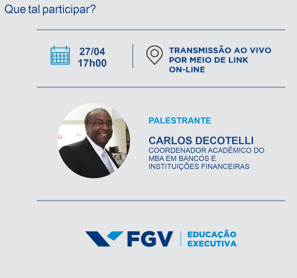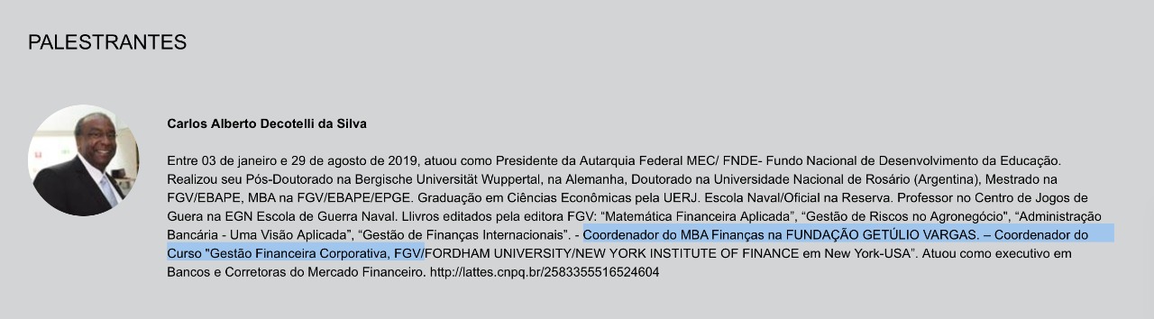 No 5º Fórum de Educação Executiva, em março, ele foi definido como “oordenador do MBA em Bancos e Instituições Financeiras da FGV, professor Carlos Alberto Decotelli da Silva”.
